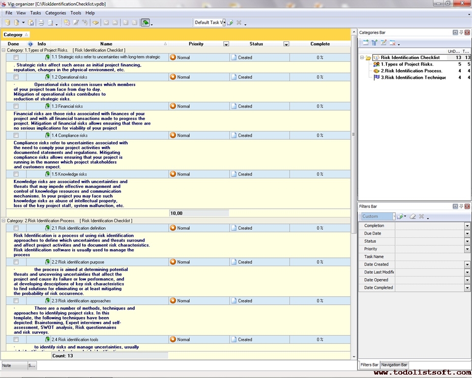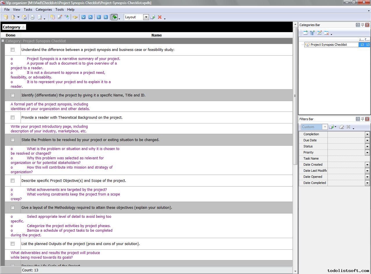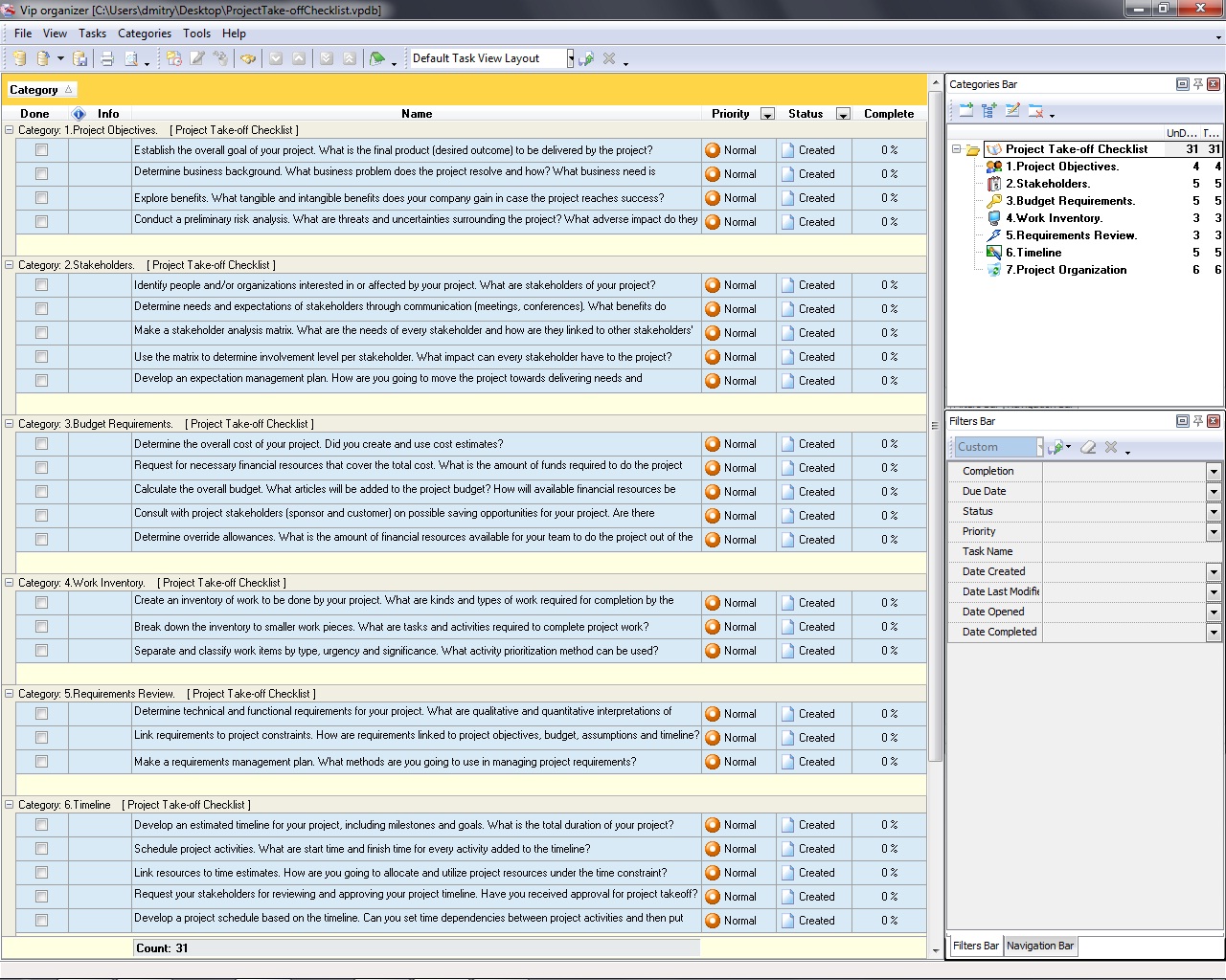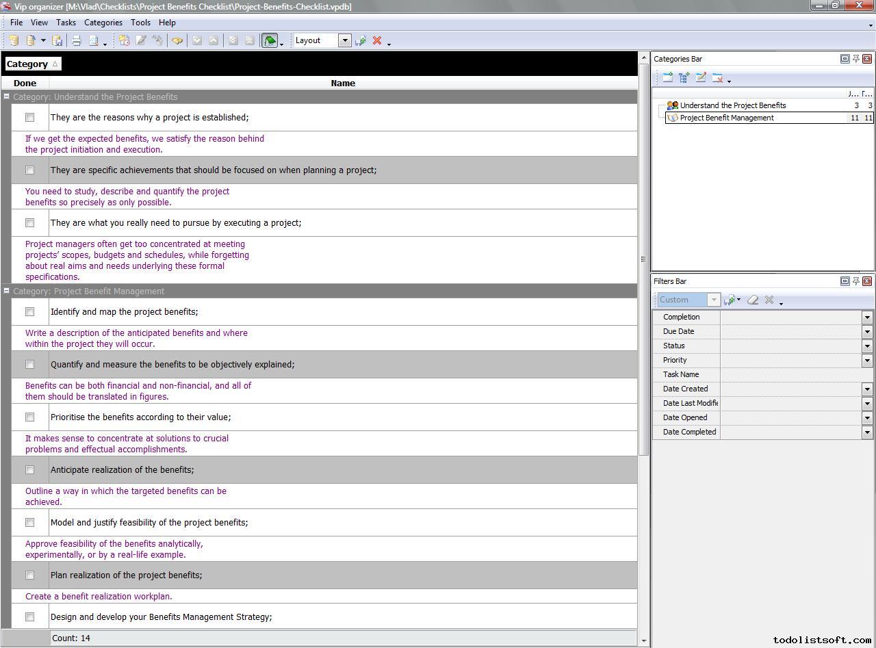 Project Benefits Checklist is created for project managers and organizations that want to plan and execute their projects in a really effective way – in a benefit-focused manner that allows developing the real value of projects. With a help of this checklist you can study and manage project benefits.   Project Benefits Checklist