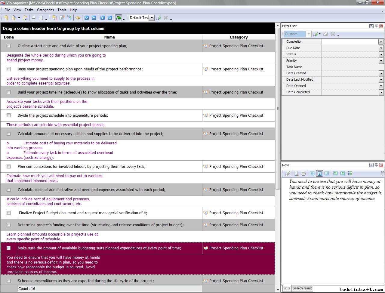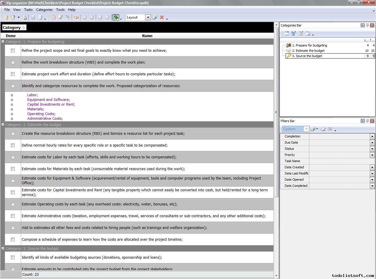 Project Budget Checklist is created to help the project managers and organizations in composing budgets for their projects. In this checklist you will find a set of actions to accomplish preparing, estimating and sourcing your project’s budget. Project Budget Checklist