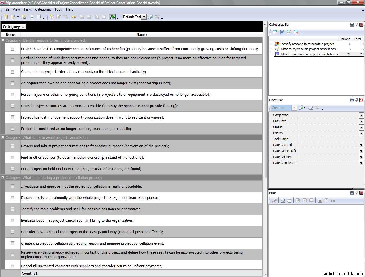 Project Cancellation Checklist is composed to help project managers in terminating their projects before the appointed time (shutting their projects down) due to some reasons. With a help of this checklist you can identify your reasons, try to prevent cancellation, and actually shut your project down appropriately. Project Cancellation Checklist