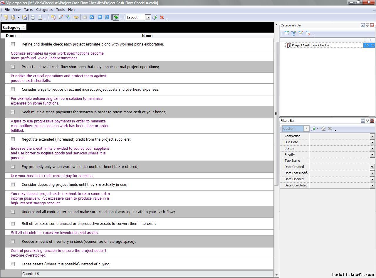 Project Cash Flow Checklist is composed for project managers who want to create and operate an essential cash reserve on their projects. In this checklist you can find a number of useful tips on how to retain and generate cash-flow on your projects.   Project Cash Flow Checklist