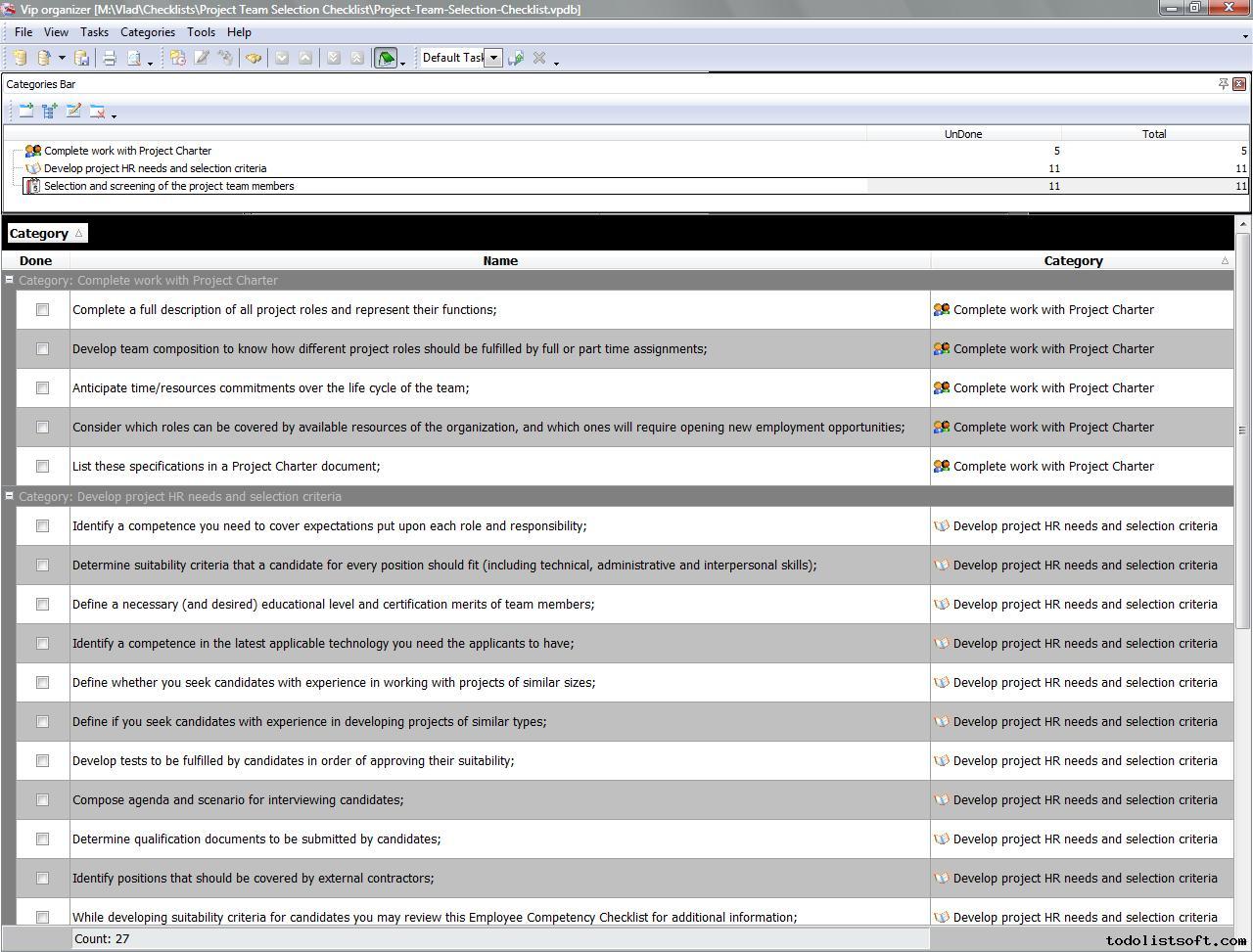 Project Team Selection Checklist is developed for the project managers and for their assistants to help them in assembling project teams of proper competence and qualification. With a help of this checklist you can manage completion of your project charter, develop project needs in manpower and set selection criteria to screen candidates. Project Team Selection Checklist