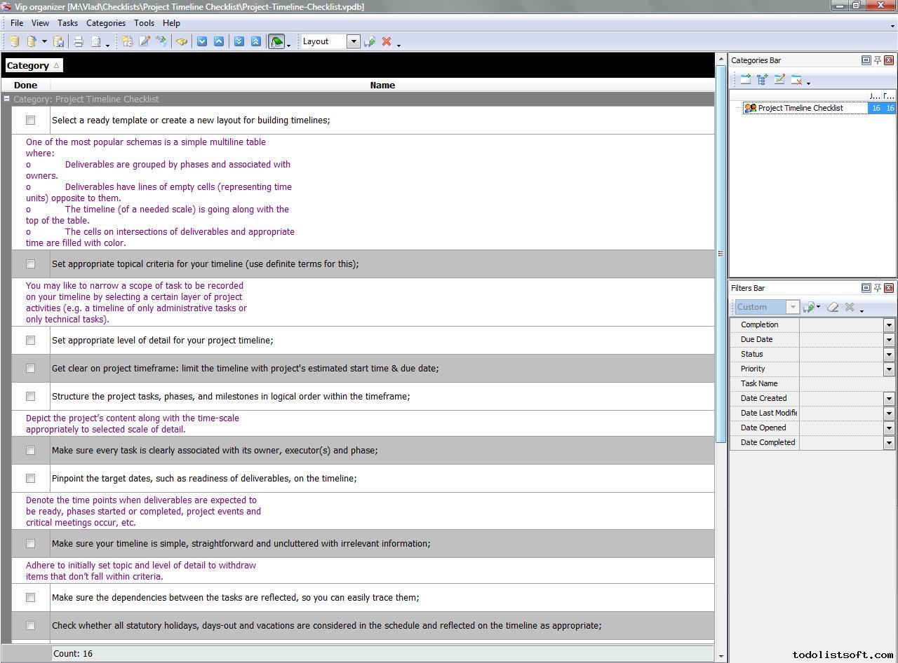 Project Timeline Checklist is created to help the project managers in their efforts at creating and managing project timelines. With a help of this checklist you can learn what activities are necessary to make sure that you have a workable timeline document.    Project Timeline Checklist