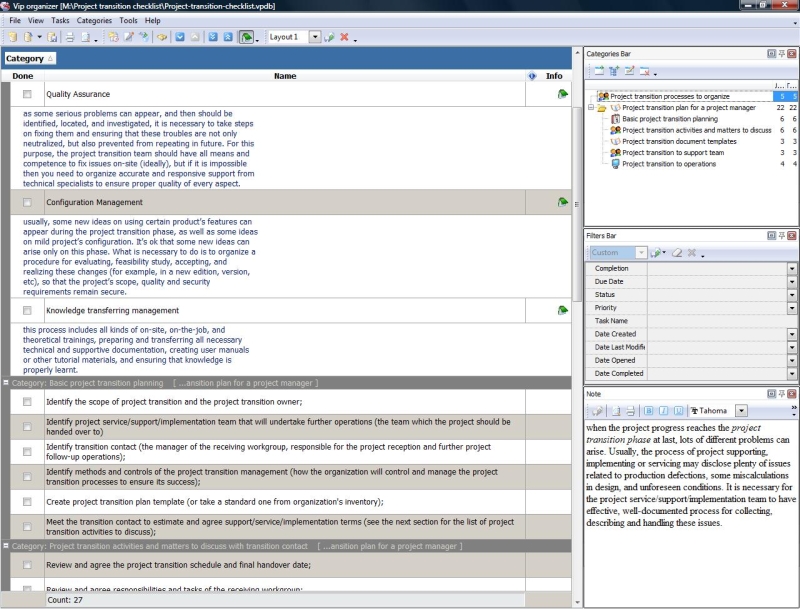 This project transition checklist explains how to undertake the procedure of handing over the project from its producers (executers) to support or operation team of project’s customers, owners or sponsors. It necessary to make sure that a set of essentials processes is established, and the project transition plan is prepared. This project transition checklist will help you to organize and control this procedure.    Project transition checklist