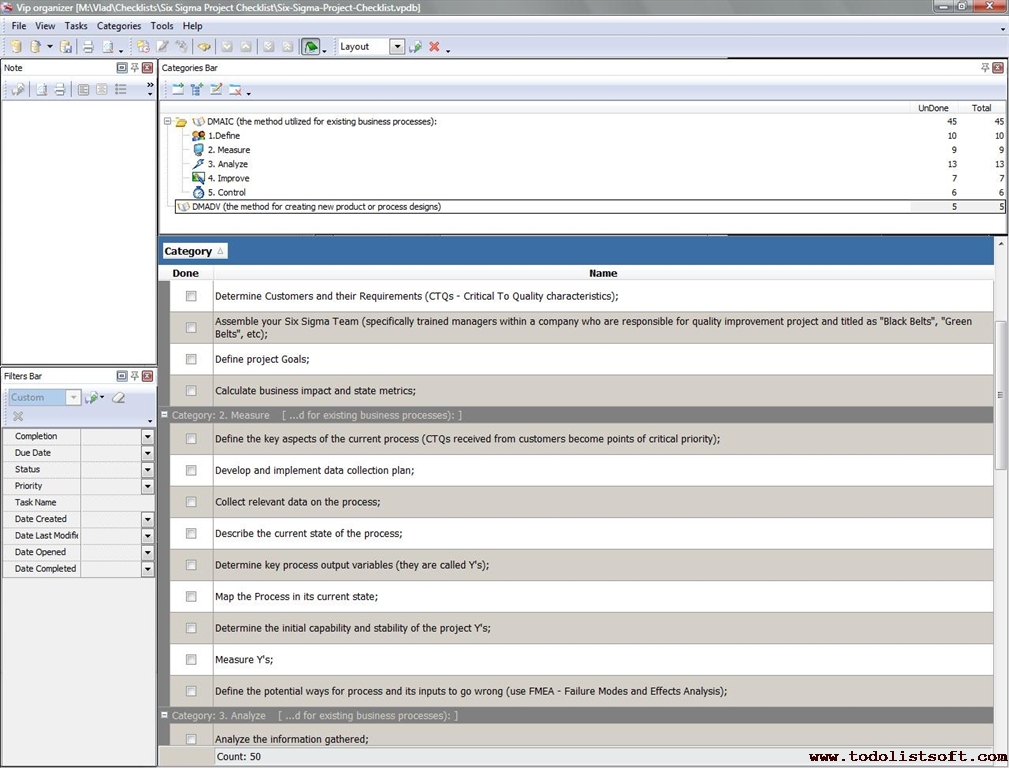 This Six Sigma Project Checklist is created to explain this famous business management strategy (initially invented by Motorola) to business managers who are interested in implementing it. Using this checklist you can study two methods included in it – DMAIC and DMADV.   Six Sigma Project Checklist