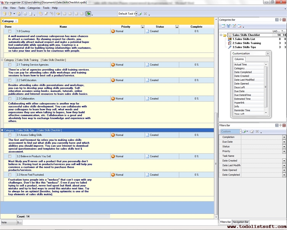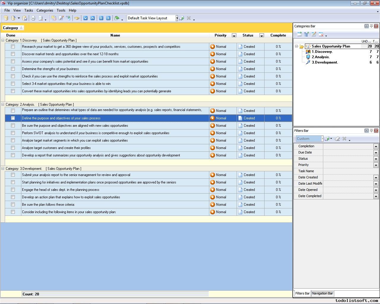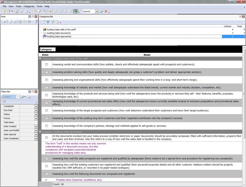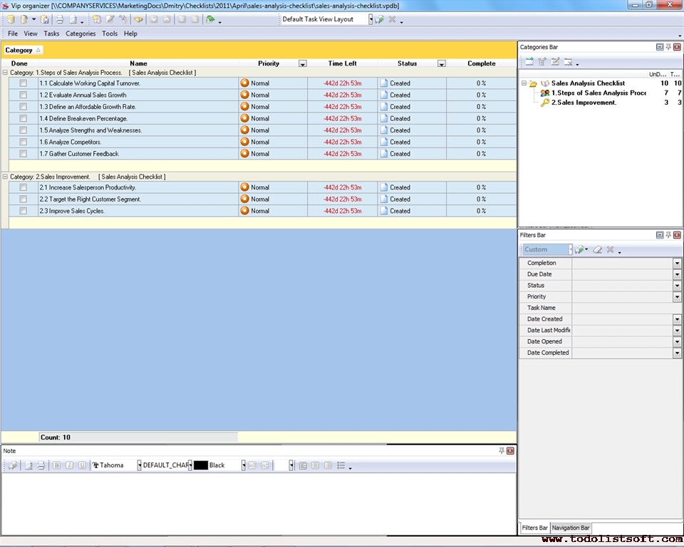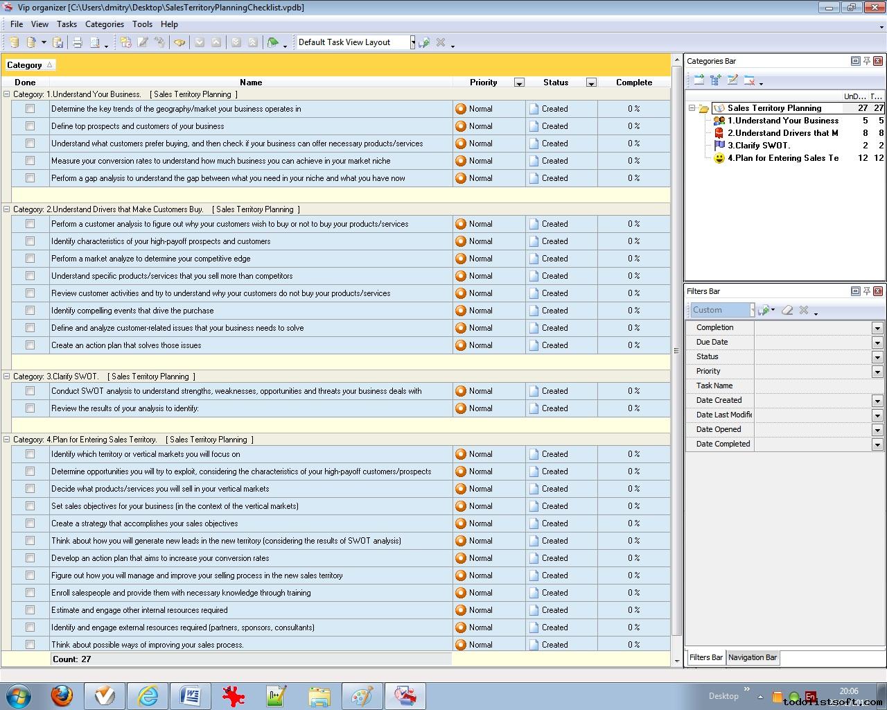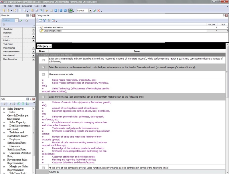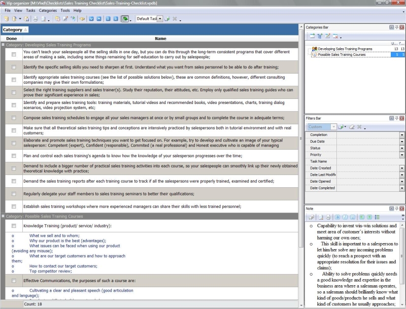 This Strategic Sales Plan Checklist explains what actions need to be done for creating a sales plan based on strategic business goals. This document is designed for sales managers, market analysts and other professionals involved in sales management. It is recommended to use the checklist with VIP Organizer software.