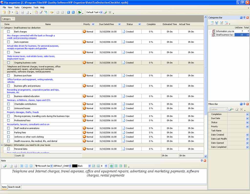 Tax Deduction template is a 'to do list' for you to make all required preparations before deducting. Use this checklist to be tax-savvy throughout the year and not to forget all deductible incidental expenses that you paid throughout the year .