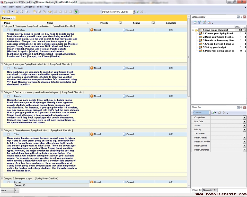 This Spring Break Checklist is designed to help students and families to organize a wonderful vacation dedicated to Spring Break time. It contains a number of suggestions and recommendations on choosing the best trip destination, developing a schedule, estimating a budget amount, and other tips.