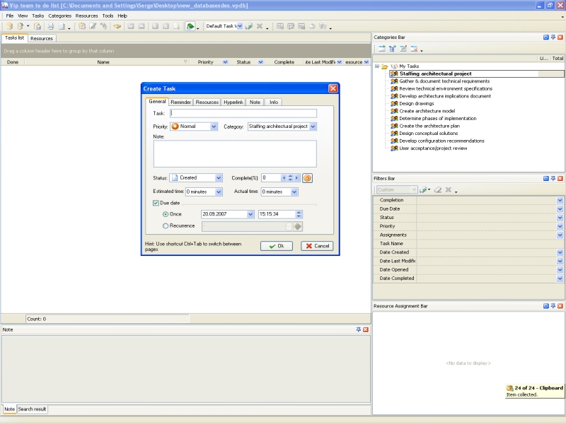 As architect works at projects, he needs for efficient time management software to avoid missed events, such as appointments, meetings, phone calls, etc. The way architect can improve his time management is to use reminders within his task list. Reminder can be set as a pop-up window at exact date and time or before some days/hours/minutes. Architect can define email recipients of reminders and configure reminder sound.