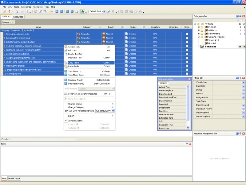 The cleaning manager can organize his tasks into categories. Task management software allows to create structured task lists by using categories and sub-categories. This functionality is helpful to manage cleaning services projects and programs. For regular projects the cleaner manager can use templates and checklists. Task management software allows to duplicate templates any time when a project is initiated. The sample template can be as follows: