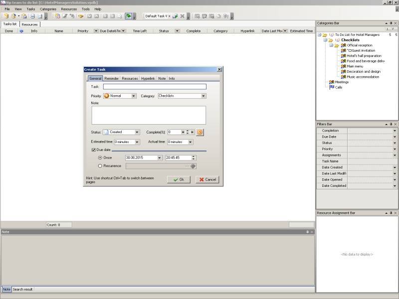 Hotel manager can create such checklists by using task management software. Certainly the checklist for the official reception may be larger and include more tasks. However, this example obviously demonstrates that event management can be efficient, and hotel manager can do his best with task management software to arrange events in hotel.