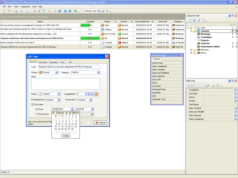 ●VIP Task Manager.. The best solution for organizations which need to control activity of HR department as well as other departments, will be VIP Task Manager. The software allows to build a centralized database each employee can enter and update his/her tasks in real time, and a supervisor will be immediately notified of any change with automatic notification system. |