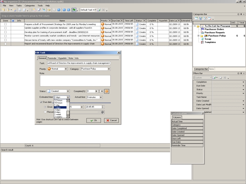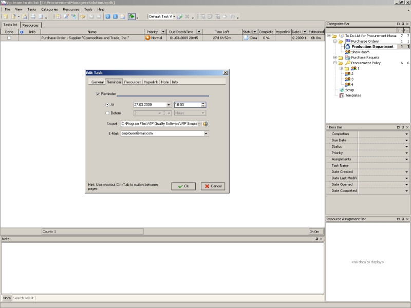 Task procrastinations and delays are inadmissible within the workflow of Procurement Department. The manager should care of timely deliveries, appropriate shipping dates and good task performance of the procurement staff members. In task management software, each task has the column “Due Date& Time”. When obtaining a new purchase request, the procurement manager sets Due Date for appropriate task. The column “Time Left” shows within what time period this order should be fulfilled. To avoid missed events and delays, the manager can set up reminders per task so that the assigned employee will get a pop-window or an email message.