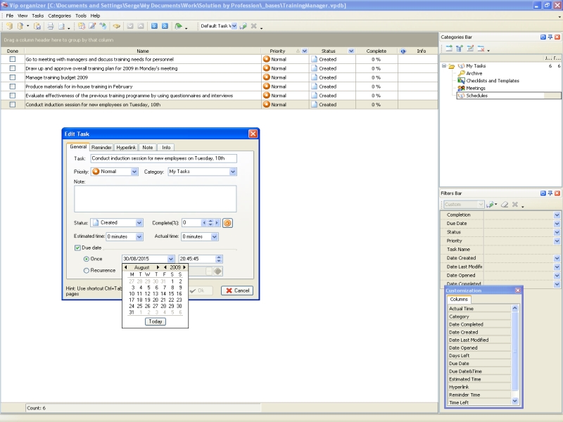 Making a to do list is not enough. All tasks in a to do list should be ranked and prioritized. The training manager should know which tasks are more important and urgent so he can be focused on them first of all. Then he will be able to effectively allocate available resources (such as time, money, labour force, etc.) to those tasks, measure the progress and even define reward for success. By using task management software, the training manager can arrange his tasks in to do lists by priorities and define which tasks should be accomplished first of all. For example, in the category “Meetings” the training manager can add agenda. The most important questions in the agenda can be prioritized so the training manager will know which questions should be emphasized. In order not to miss an event or not to forget to perform an important task, the training manager can set task reminder as a pop-up window or email message.