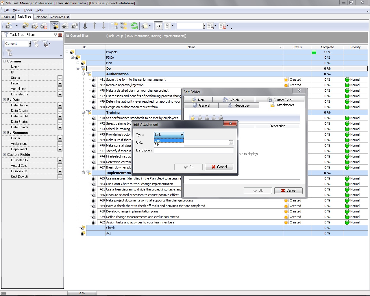 As we’ve already mentioned, VIP Task Manager allows you to create tasks and combine them into checklists and templates. We recommend you to use Task Tree view of the software to make a checklist of tasks for accomplishing the activities of the Do step. For example, you can try to use this task checklist: