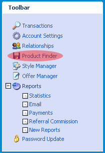 After you have filled out the Affiliate Sign Up form you will get a letter from RegNow with your affiliate ID number, password and URL to choose our products you would like to link to. Login to your affiliate account at RegNow and click the "Product Finder" link.