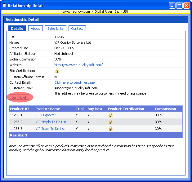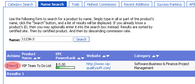 Search results will appear, click the "View!" button to see relation status and the links you have to place on your web site in order to forward buyers to us or directly to our product purchase page.