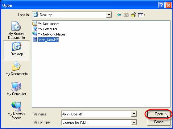 6. In "Open" dialog find and select the ".ldf" code (ex.: John_Doe.ldf on Desktop)