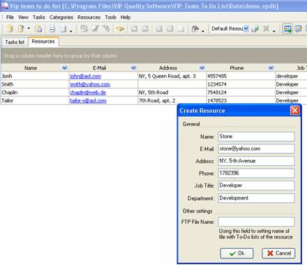 To create new resource click on ‘New Resource’ button on Resources toolbar. Enter new resource name, e-mail, address, phone, job-title, name of his or her department and ftp file name in corresponding fields in ‘Create Resource’ dialog.