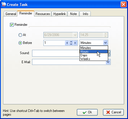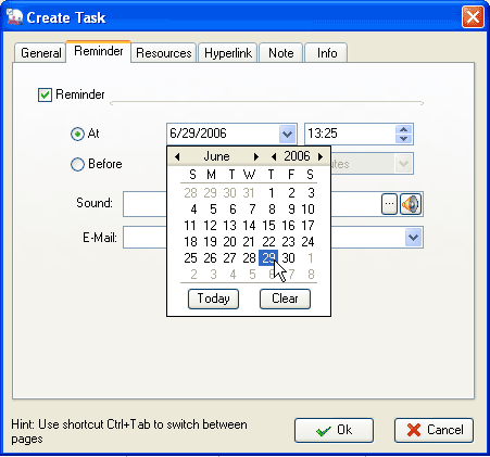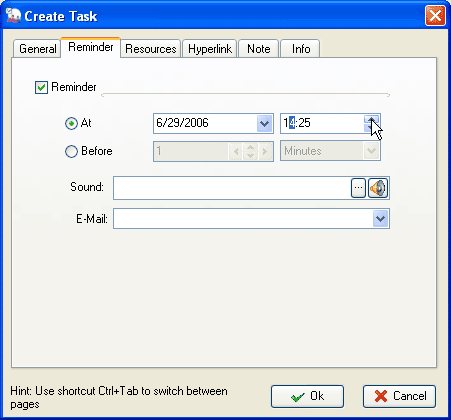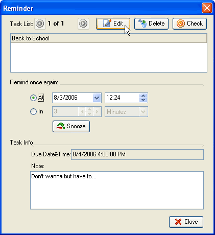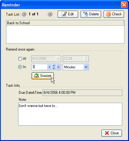Popup desktop message shows the task info and allows you to edit, delete and check the task within Reminder window. You can postpone the alarm for a certain time period by Snooze or clear the reminder by Close button.