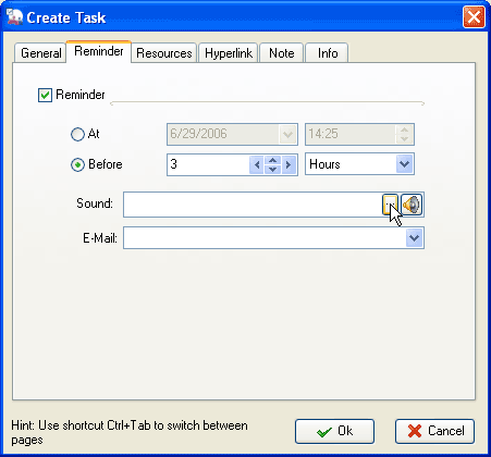 You have set reminder to receive a desktop message. If you want the program to play a sound or your favorite song as alarm, you should select the music file from its location.