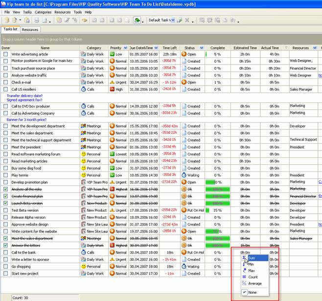 You can track how much time you need to accomplish all the tasks or how much you have spent on already completed tasks. Right click on Task List footer under ‘Estimated Time’ or ‘Actual Time’ column and select ‘Sum’ from drop-down list.