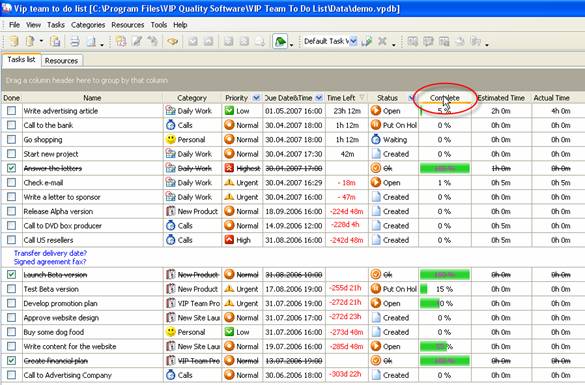 In the same way you can track your tasks by their progress. Click on ‘Complete’ column header on Task List grid to sort the tasks from 0% to 100% or vice versa.